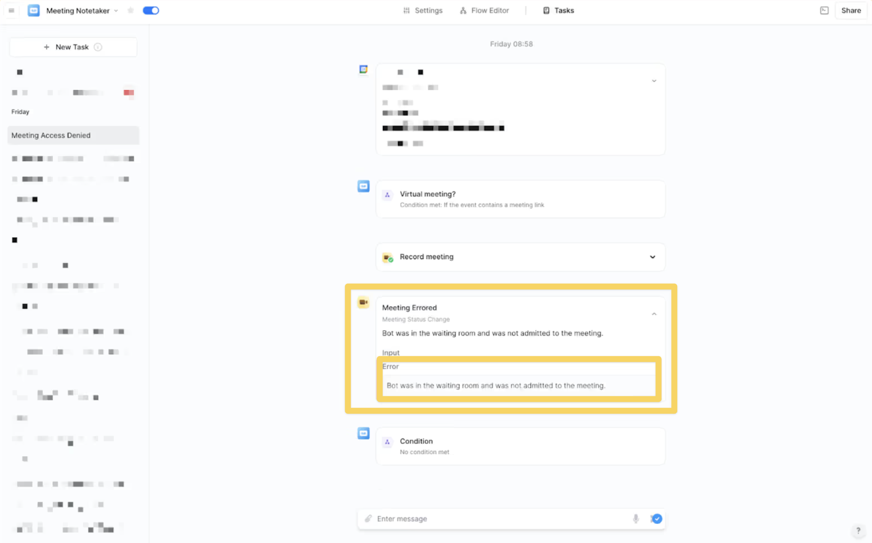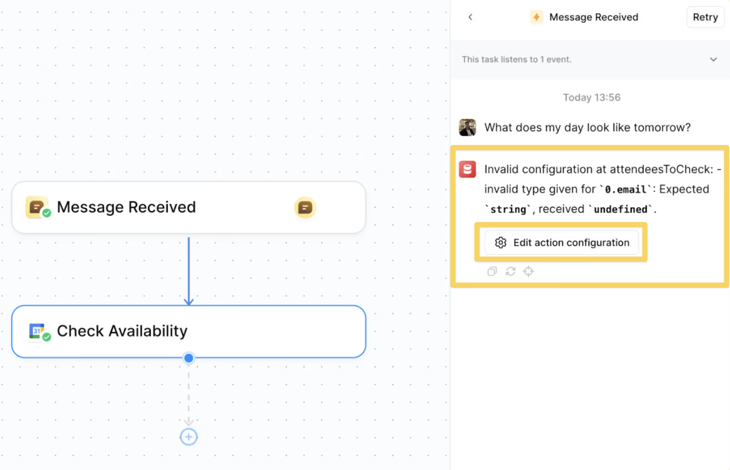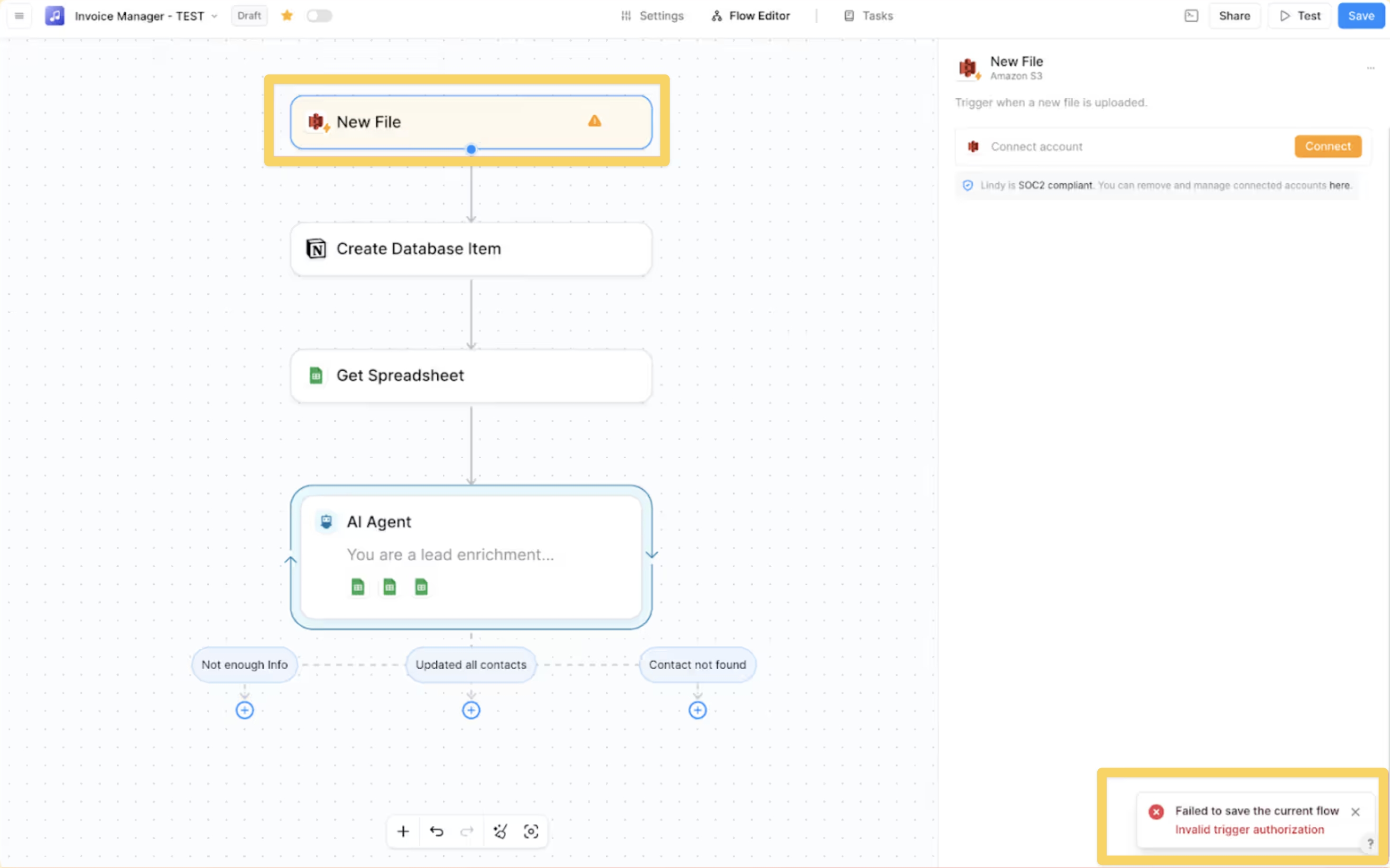 When an error occurs, your agent notifies you directly within your Task History, Flow Editor, and via email, so you can address issues immediately.Review Errors in Flow Editor Using Test Mode
